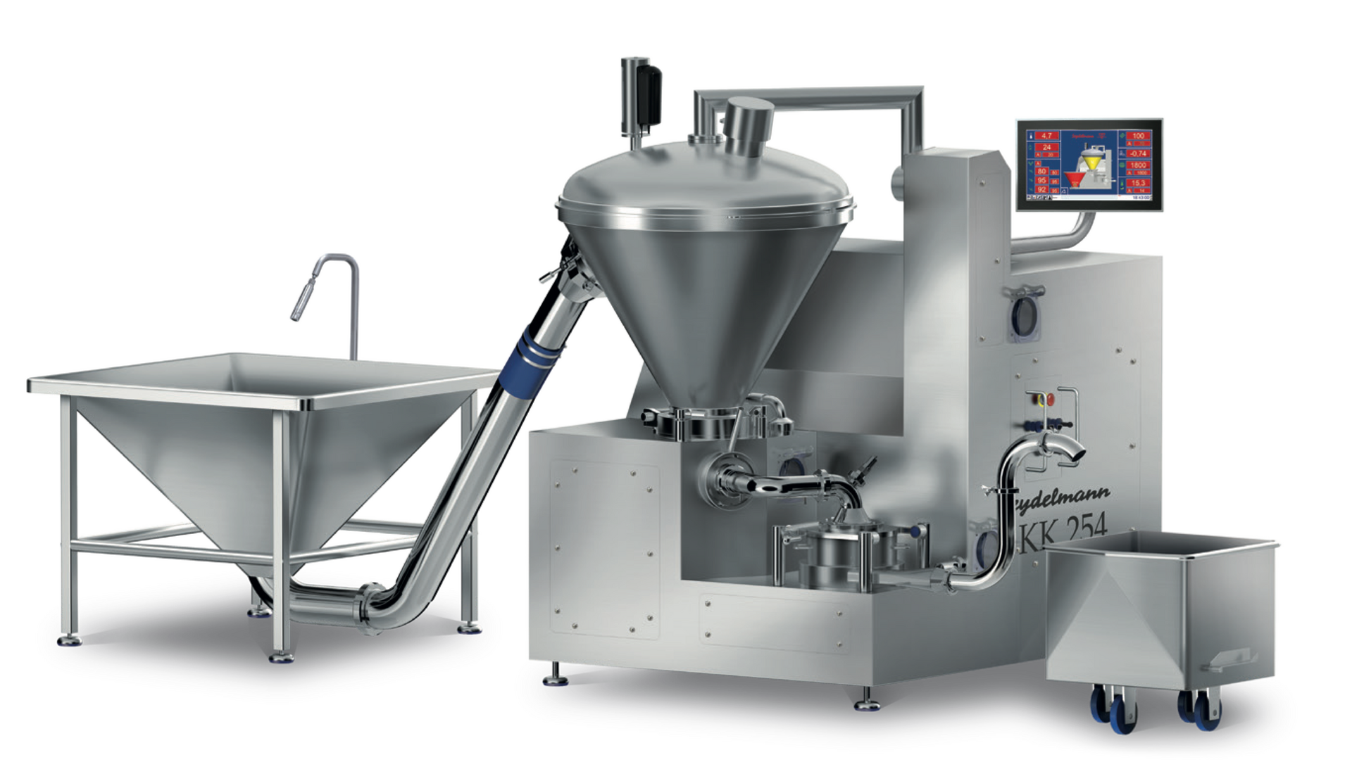 Buffer screw conveyors and vertical buffer screw conveyors optimize product flow and space utilization. Storage hoppers and silos are individually adapted, robust, easy to clean, and meet high hygienic standards. Pumps and pipe systems, featuring wear-free, non-abrasive screw spindle pumps, transport finished products gently. Loading devices, including hydraulic, large container, and vertical options, further enhance efficiency in loading various machines. Seydelmann's expertise lies in delivering a fully integrated and hygienic conveying and storage technology suite for diverse production needs.